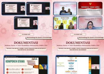 Jurusan Pendidikan Matematika, Fakultas Matematika dan Ilmu Pengetahuan Alam, Universitas Negeri Yogyakarta sukses menyelenggarakan Webinar Series #4 Tahun 2025 pada Sabtu, 27 September 2025, dengan tema “Sinergi Matematika dan Teknologi untuk Pembelajaran Abad 21”. Acara ini dibuka secara resmi oleh Dr.