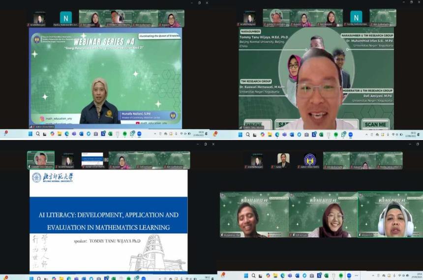 Department of Mathematics Education, Faculty of Mathematics and Natural Sciences, Yogyakarta State University Successfully Held Webinar Series #4 in 2025 The Department of Mathematics Education, Faculty of Mathematics and Natural Sciences, Yogyakarta State University, successfully held the Webinar Series #4 of 2025 on Saturday, September 27, 2025, with the theme “Synergy of Mathematics and Technology for 21st Century Learning.” The event was officially opened by Dr. Kuswari Hernawati, S.Si., M.Kom., who, in her opening remarks, emphasized that the webinar aimed to strengthen educators' understanding of how to use technology effectively while ensuring that the role of mathematics remains relevant and contextual in facing the challenges of 21st-century education.